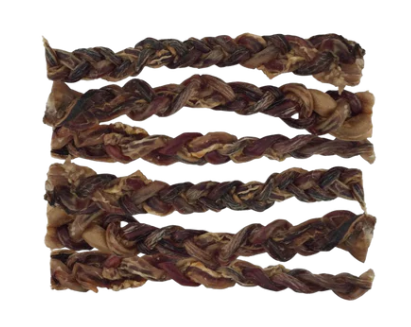 Our Braided Piggy Sticks Dog Treats are made from 100% natural pork pizzle. They are slow roasted for delicious flavor and cooked without any artificial additives or preservatives.